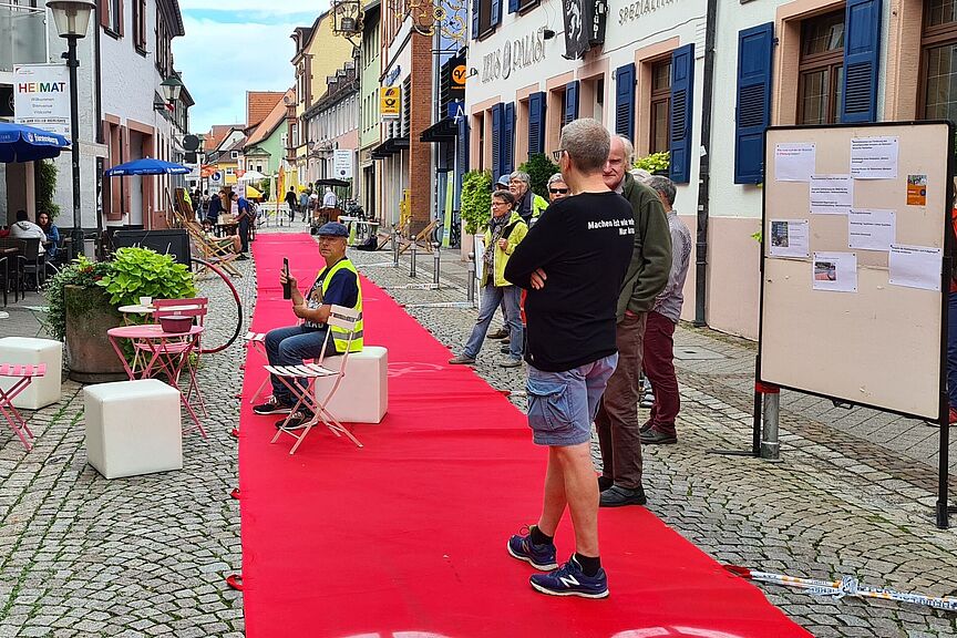 Ein roter Teppich machte den Weg frei für Radfahrende und Fußgänger*innen. Zahlreiche ansässige Geschäfte und Initiativen unterstützen den ParkingDAY oder beteiligen sich aktiv.