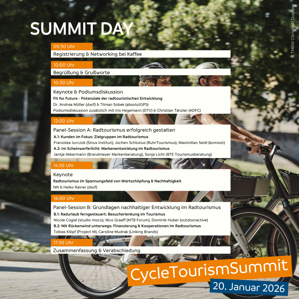 Der CycleTourismSummit ist die Plattform für alle, die Radtourismus nachhaltig und zukunftsorientiert weiterentwickeln und gestalten wollen. Mit inspirierenden Impulsvorträgen und Panels, motivierenden Beispielen aus der Praxis und gewinnstiftendem Austausch bietet der CycleTourismSummit neue Perspektiven und Ideen für den Radtourismus von Morgen.